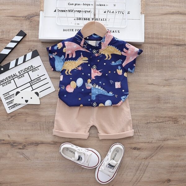 เสื้อคอจีนลายไดโนเสาร์ น้ำเงิน & กางเกงขาสั้น – babiesfirstshop